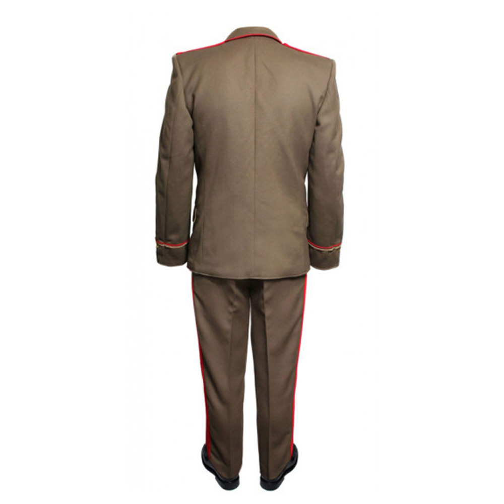 Ussr army marshalls military uniform made for everyday use. jacket comes with shoulder boards, embroidery on the collar and sleeves and red piping on the sleeves. trousers with red stripes on the sides. visor hat is included.